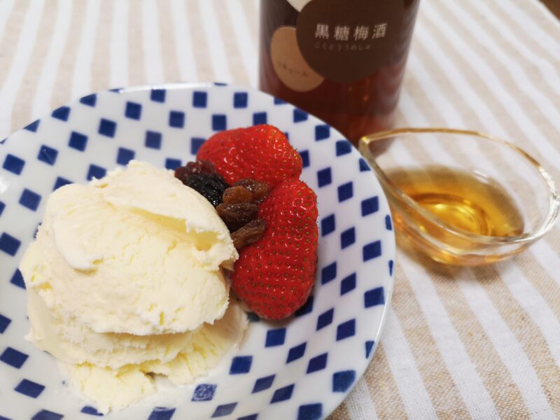 アイスクリームに少し黒糖梅酒をふりかけるだけで、普段食べているバニラアイスクリームが大人のスイーツに。