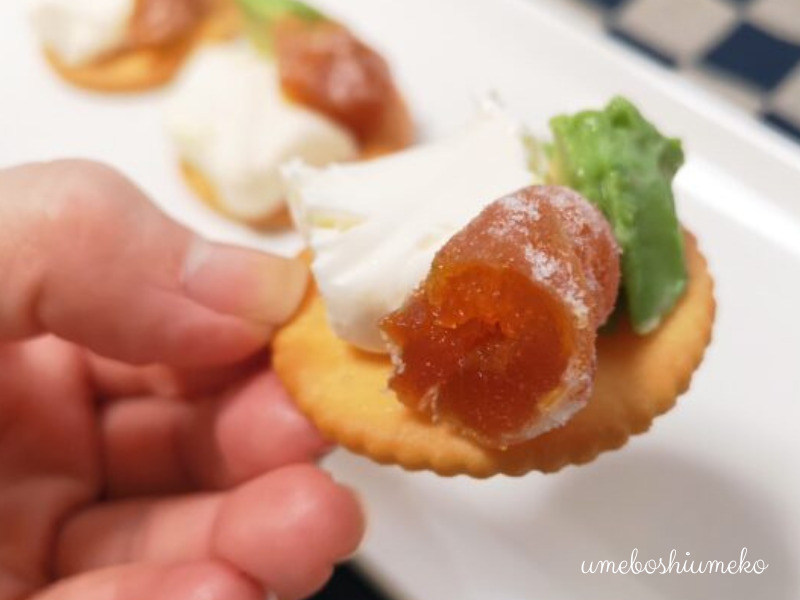 今回はクラッカーに甘梅干し、アボカド、クリームチーズをのせてみました。