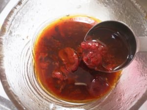 ④ポン酢大さじ4、オリーブオイル大さじ1、梅干しをまぜる。