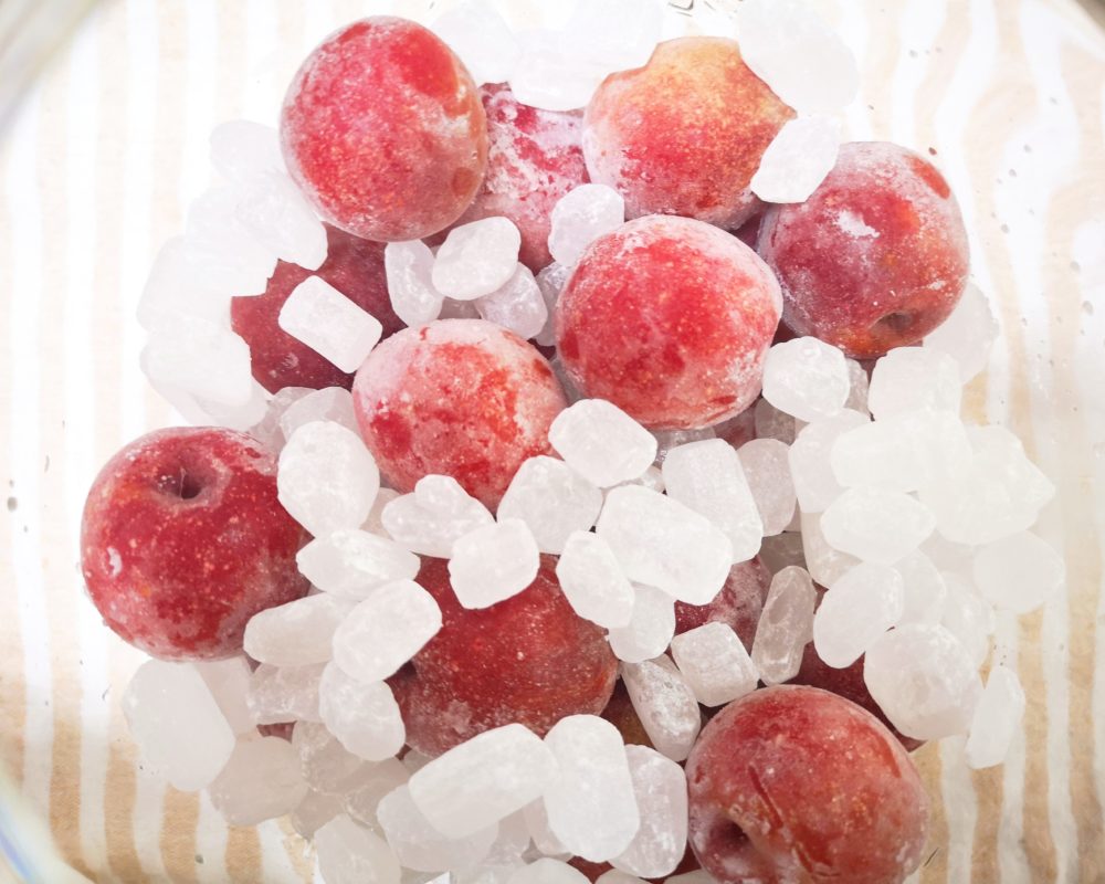 ①瓶に梅の実、氷砂糖を交互に入れていきます。