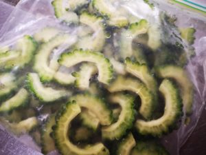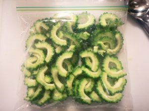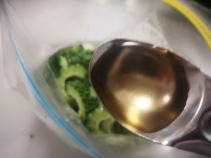 ②キッチンバッグにゴーヤ、白梅酢、はちみつを入れて一晩おいておく。
