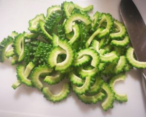 ①ゴーヤのワタを取って半分に切り、輪切りにします。