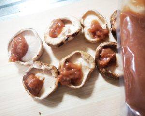 ②しいたけの内側に梅びしおを小さじ1弱づつくらい乗せてスプーンなどで広げます。