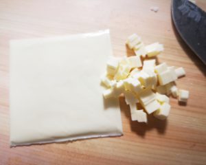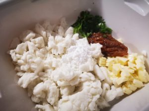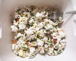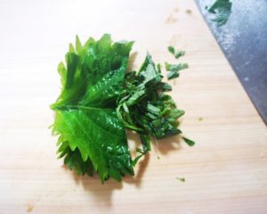 ③つぶしたはんぺん、梅干し、大葉、チーズ、片栗粉を入れてまぜます。