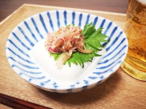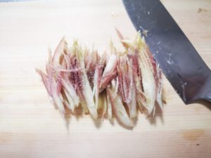 ①みょうがを細く刻んで塩を一つまみかけておきます。