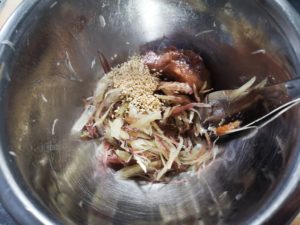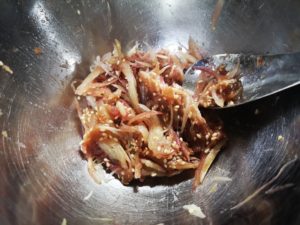 ボールにみょうが、叩いた梅干し、白ごま大さじ1を入れて混ぜます。