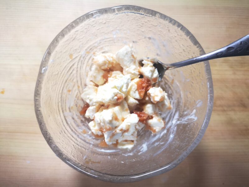 ③クリームチーズと和えます。もう一度冷蔵庫に入れ冷やします。
