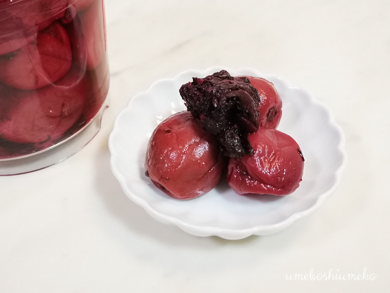 梅酢いっぱいに漬かっていてとっても酸っぱいです。