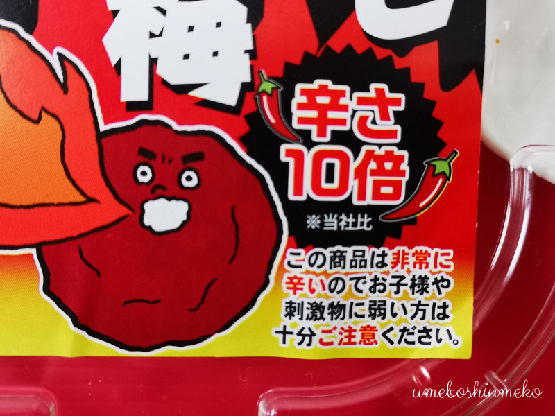 通常のとうがらし梅の約10倍辛い梅干しで、とうがらしがいっぱいまぶしてあります。