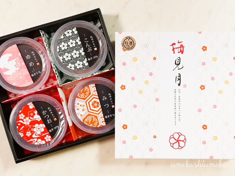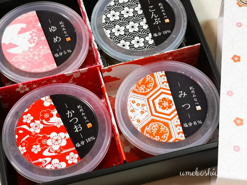 塩分控えめで誰でも食べやすい人気の梅干し4種類が入っていて、パッケージもかわいい和柄なのでちょっとしたプレゼントでも喜ばれそうです。