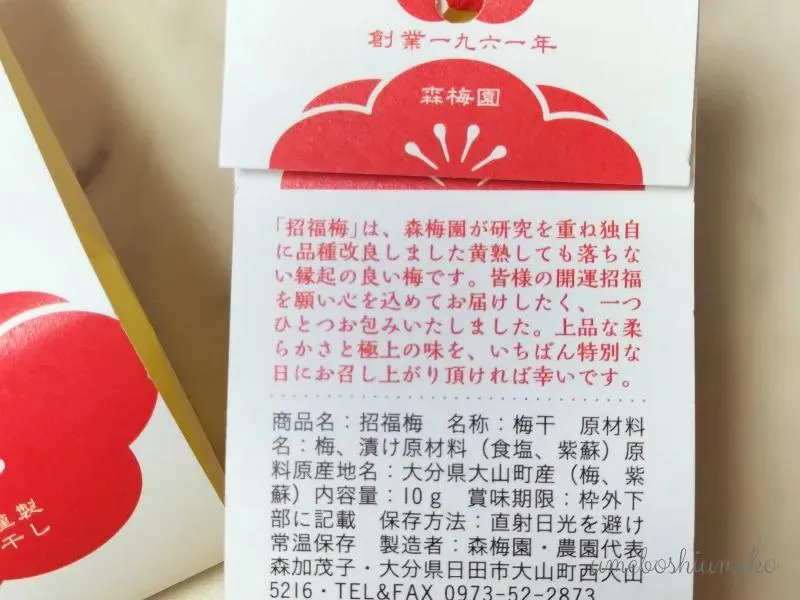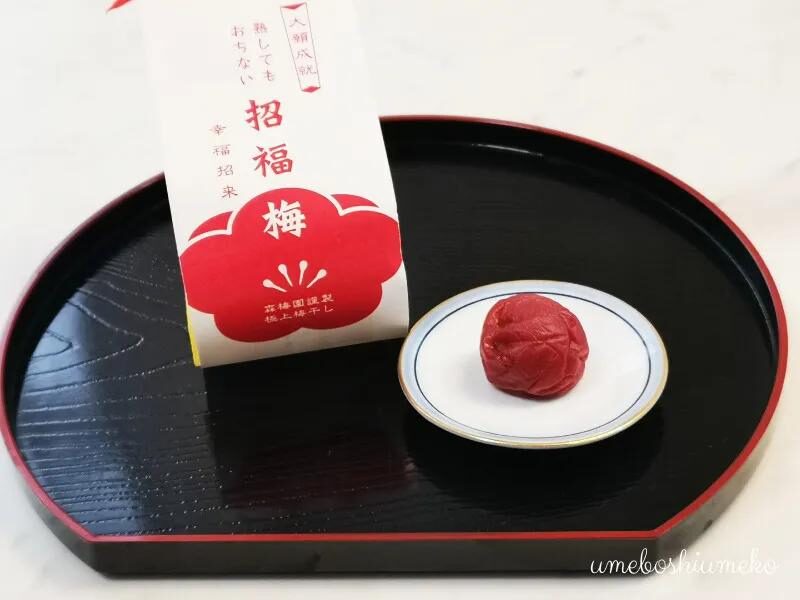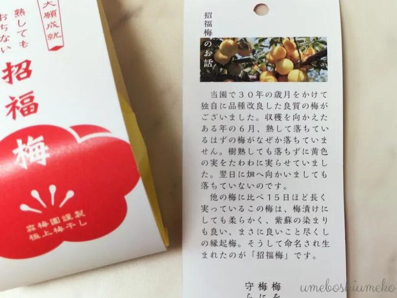 梅漬けにしても柔らかく、紫蘇の染まりもとてもよい、良いこと尽くしの縁起梅!という事で「招福梅」と命名されました。