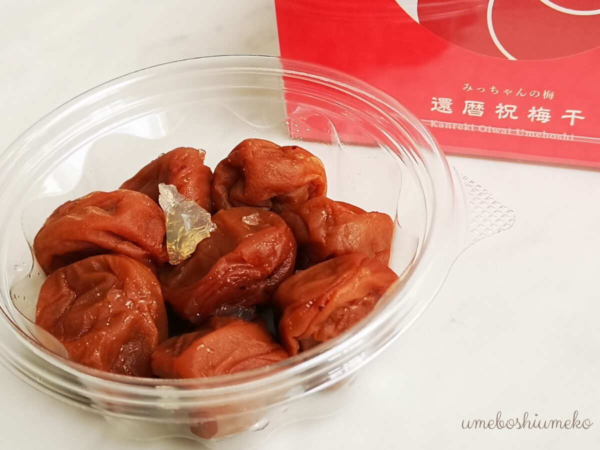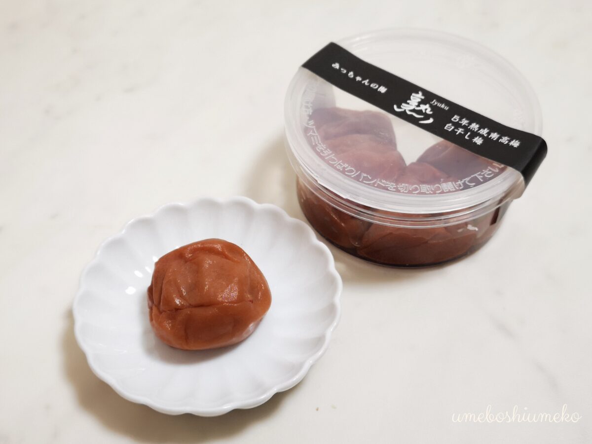 5年間熟成して寝かせてあるので、1年物の梅干しよりもう少しまろやかに。