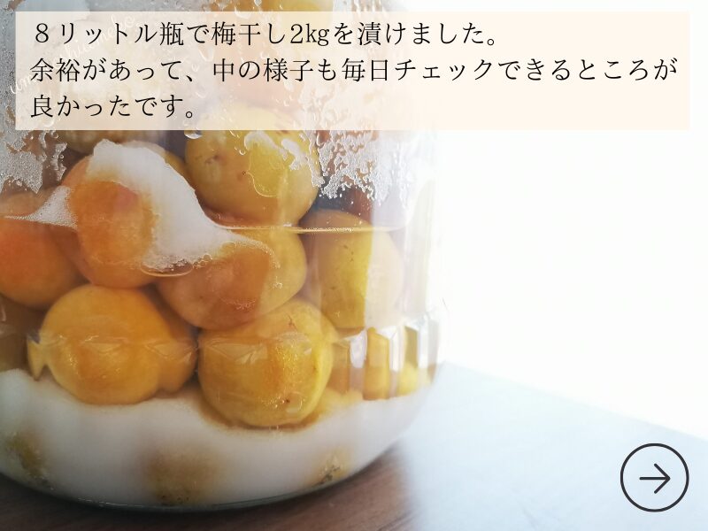 梅干しを漬ける時に8リットル瓶を使用しましたが、梅の様子をきちんとチェックできるのが良かったです。